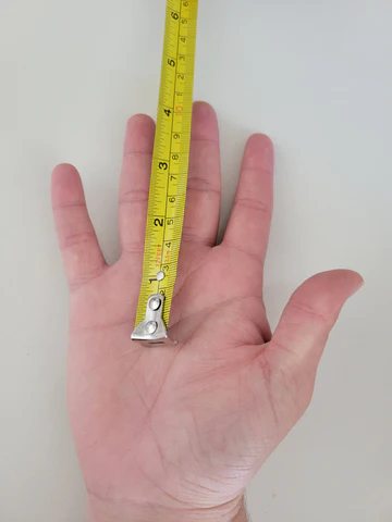 Ouvrez votre main dominante, paume vers le haut et doigts serrés (pouce écarté). À l’aide d’une règle, mesurez la distance entre la ligne de pli médiane de la paume et l’extrémité de votre annulaire. Cette mesure, généralement comprise entre 10 cm et 12 cm, correspond à la circonférence idéale du grip.